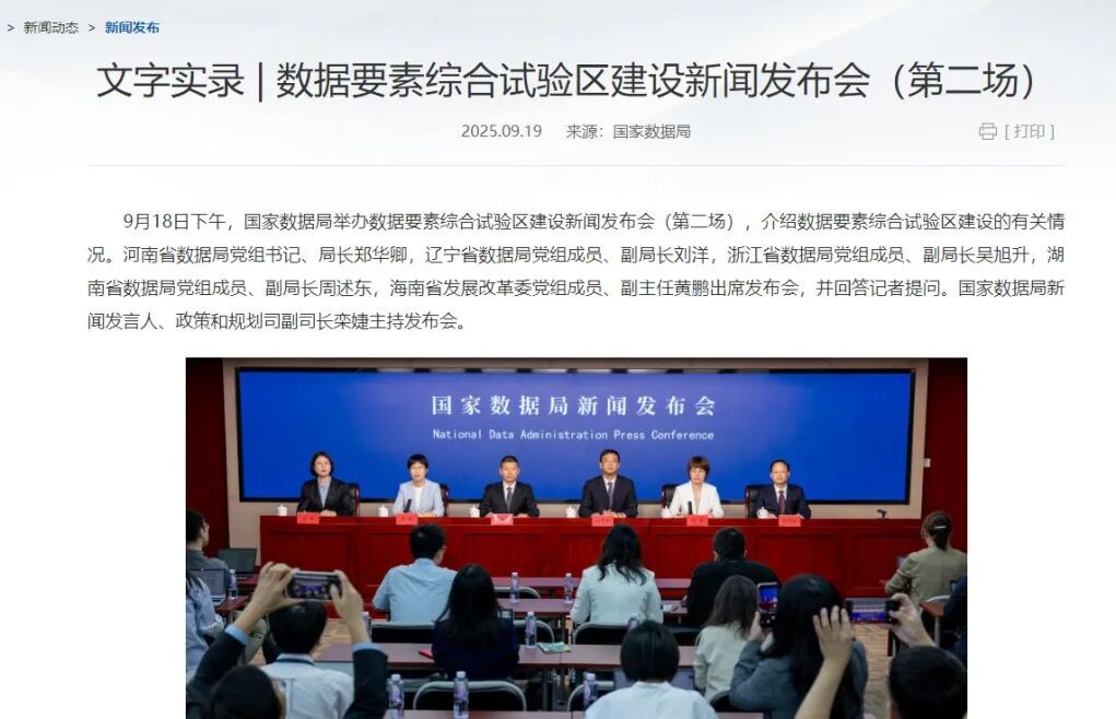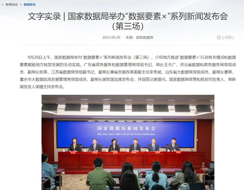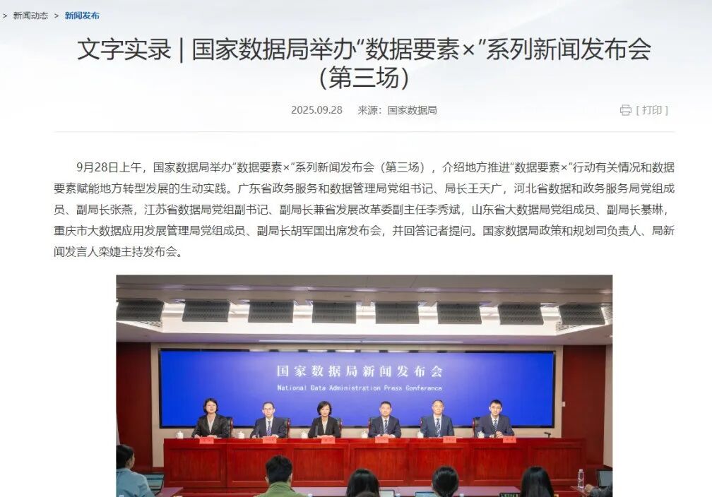 2025年9月28日,国家数据局举办“数据要素×”系列新闻发布会(第三场),自2025年7月至9月已连续举办三场重磅新闻发布会,系统介绍了数据要素综合试验区建设进展和“数据要素×”行动成果。