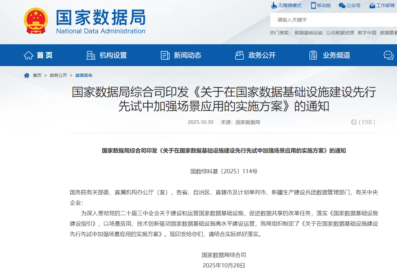 10月28日,国家数据局综合司最新印发的《关于在国家数据基础设施建设先行先试中加强场景应用的实施方案》标志着我国数据基础设施建设从”建得好”向”用得好”的关键转变。